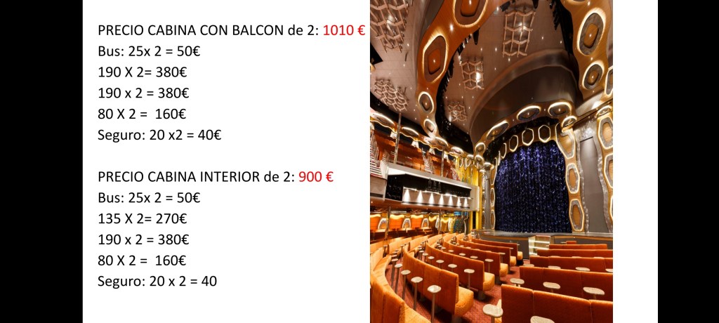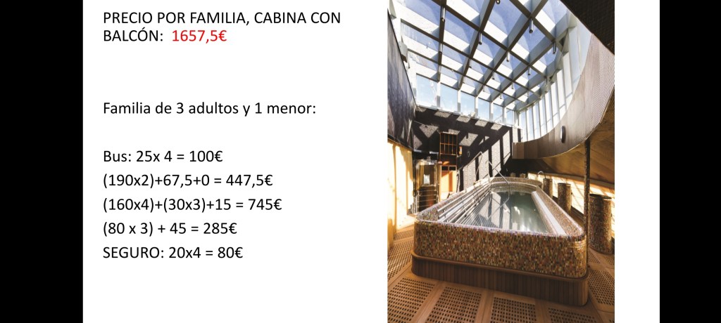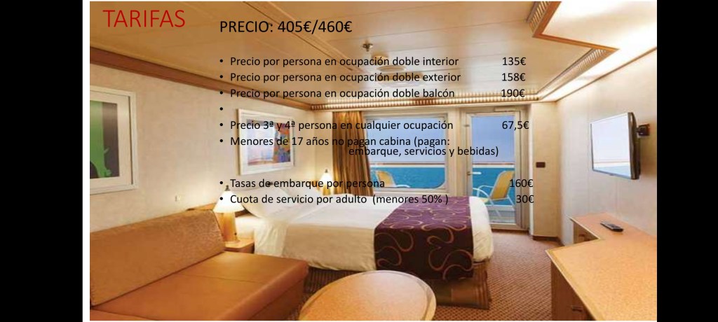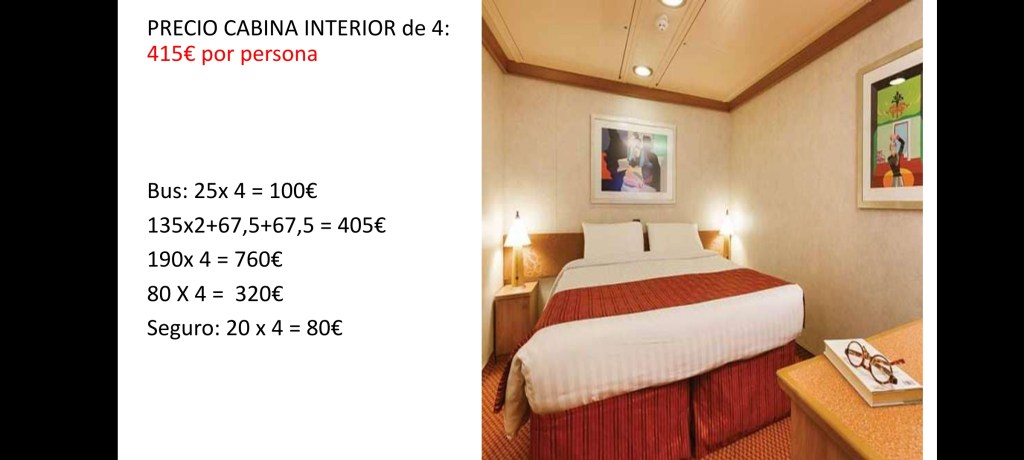 Para calcular cuánto os puede costar aproximadamente, según el caso particular de cada casa y cuántas personas vayan a ocupar el camarote correspondiente, a continuación dejamos unas diapositivas con los precios y diferentes opciones: