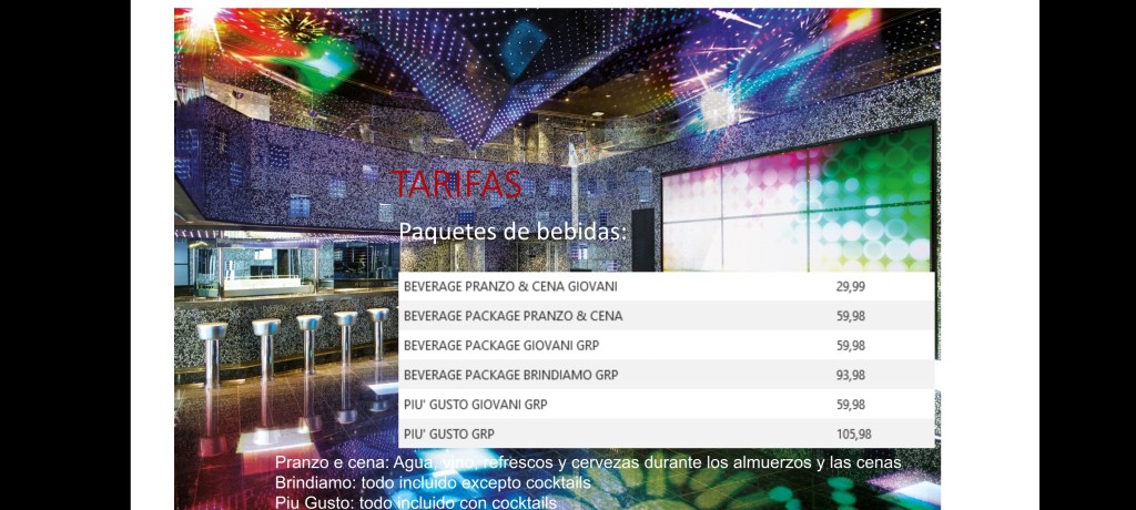 - Desde el momento en que estemos todos alojados, disfrutaremos de una estancia en el barco en régimen de TODO INCLUIDO, es decir, se puede comer y beber en cualquier zona del barco y en cualquier momento. ATENCIÓN: es muy importante tener claro que los menores de 18 años no podrán consumir alcohol y que cada menor es responsabilidad de sus padres, de modo que si no se cumplen las normas podrían llegar a ser expulsados del barco.