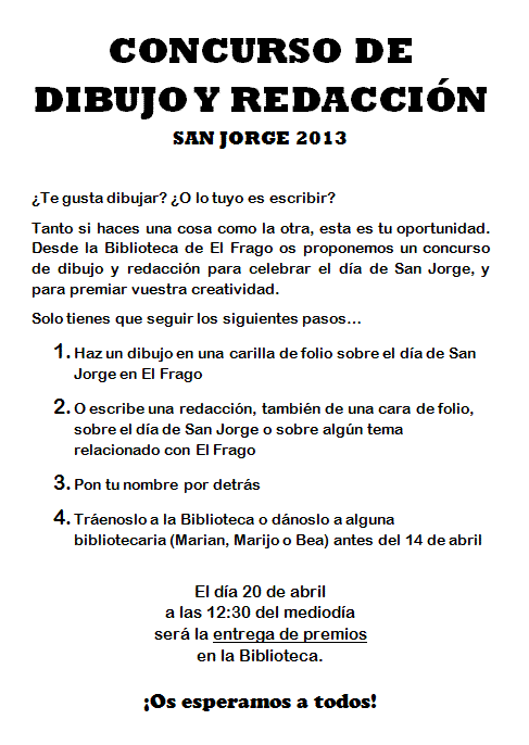 Aunque acabamos de volver de la Semana Santa, no os despistéis, San Jorge está a la vuelta de la esquina. La Biblioteca de El Frago organiza un concurso de dibujo y redacción, y si queréis participar deberíais ir pensando en vuestras creaciones (o decírselo a vuestros chicos) porque todos los participantes tendréis premio.