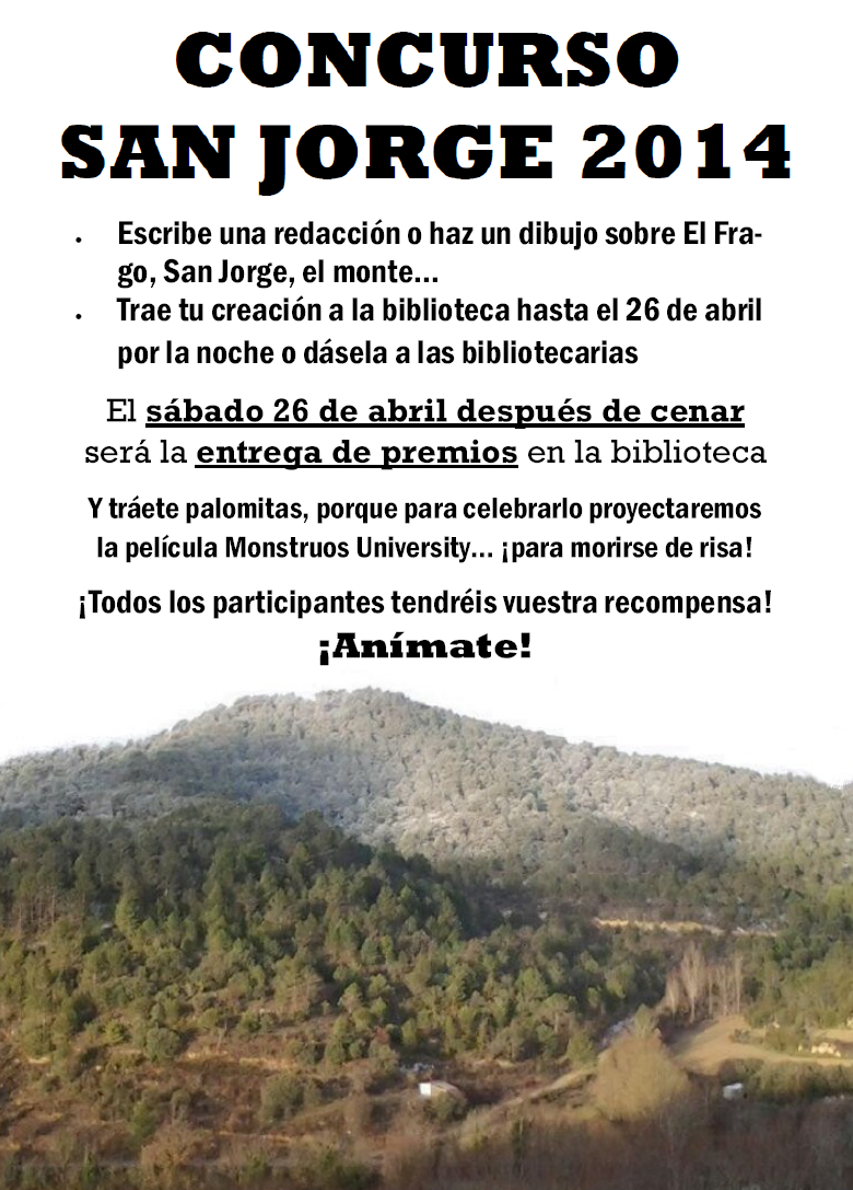 monte san jorge 2015Pero desde ya podéis ir pensando y trabajando en ese día, porque llega el III Concurso de San Jorge organizado por la Biblioteca. Como los protagonistas de este concurso son «San Jorge» y «El Frago», alguna de esas dos palabras tendrán que aparecer en las creaciones que participen, tanto si se trata de la categoría de dibujo como la de redacción. concurso san jorge 2015¡Manos a la obra! Vuestros dibujos y redacciones se podrán presentar hasta el mismo sábado 25 de abril, día en que será la entrega de premios con muchas sorpresas. Pero solo uno podrá llevarse el primer premio, el que mejor dibuje o escriba, el más original… ¿serás tú?